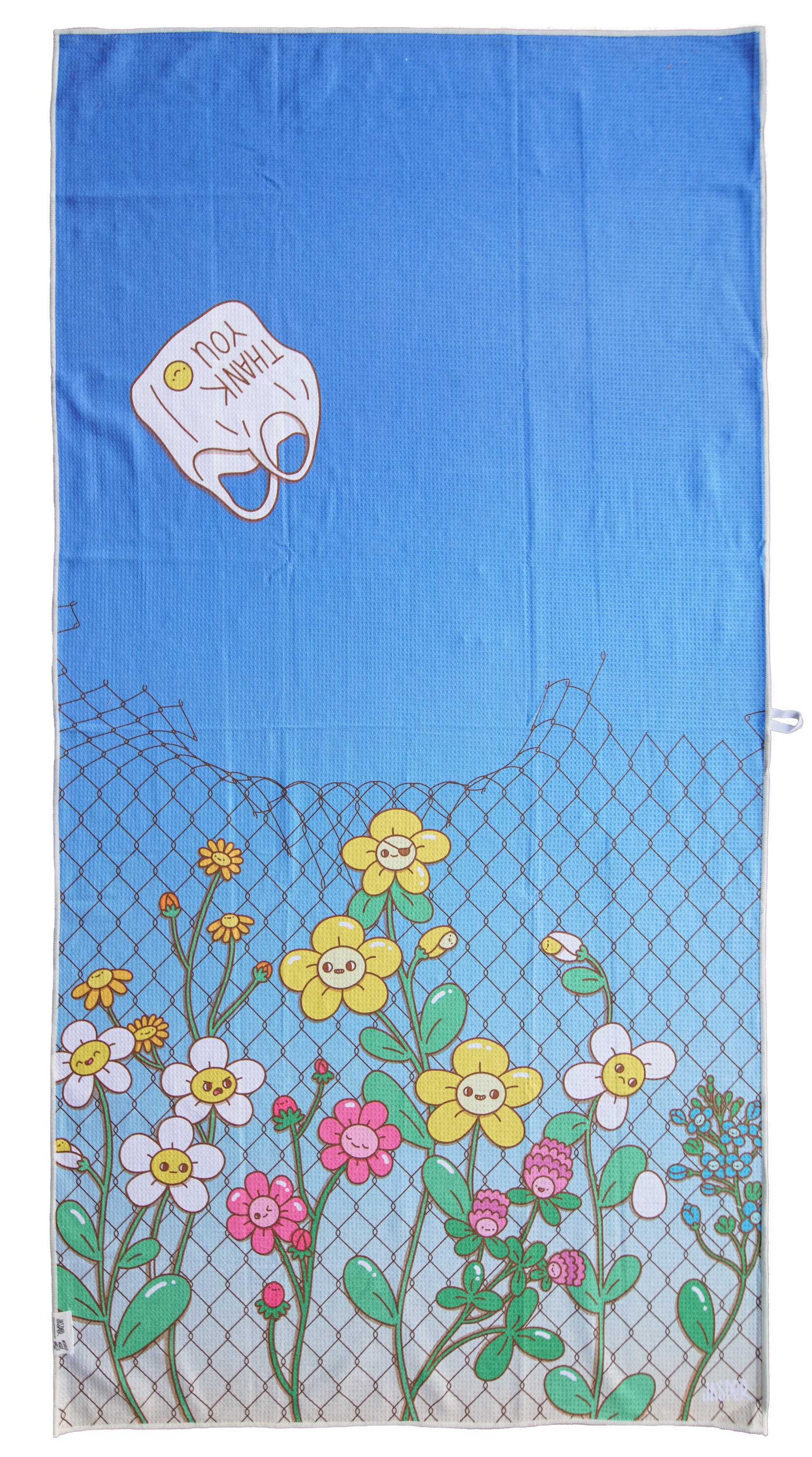 This towel draws inspiration from the beauty found in the everyday and the often forgotten. Its design features wildflowers, plants that many dismiss as weeds meant to be pulled and discarded. Yet they thrive in the cracks of sidewalks and along broken chain link fences, resilient and striking when we pause to notice them. That same spirit of unexpected beauty is echoed in the way plastic bags catch the wind, drifting and dancing across the sky as small moments of poetry in the mundane.
